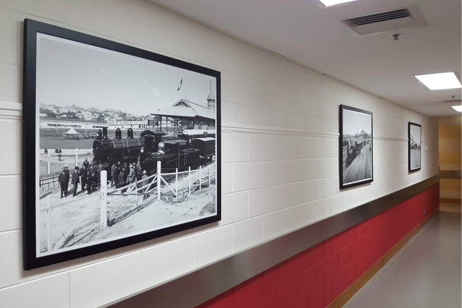 Custom manufactured Picture Frame Rail system installed at the Queensland State Archives at Runcorn. Picture frames produced to sit both landscape and portrait on the system with easy change out of images.